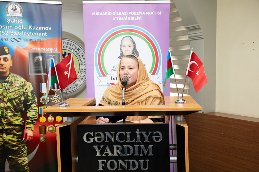 Təqdimat mərasimini giriş sözü ilə açan Mirvarid Dilbazi Poeziya Məclisi İctimai Birliyinin sədri Güllü Eldar Tomarlı qonaqları salamlayaraq bildirib ki, şəhidlərimizin xatirəsi xalqımızın yaddaşında daim yaşayır və onların qəhrəmanlıq yolu gələcək nəsillər üçün örnəkdir.
